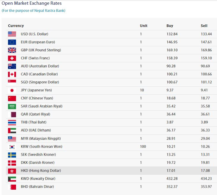 अमेरिकी डलर एकको खरिद दर १३२ रुपैयाँ ८४ पैसा र बिक्री दर १३३ रुपैयाँ ४४ पैसा पुगेको छ।