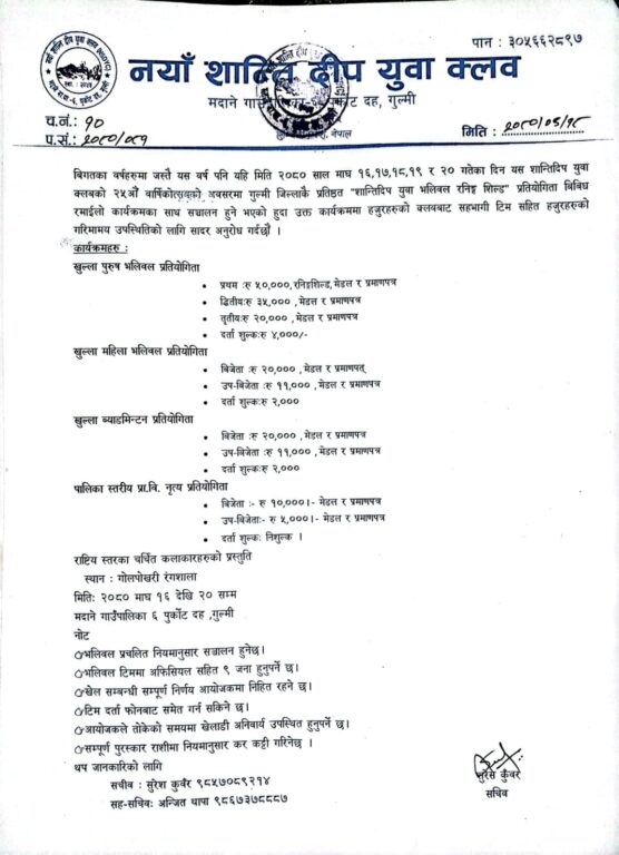 यस्तै महिलातर्फको भलिबलमा प्रथम हुने टिमलाई नगद रुपैयाँ २० हजार, मेडल र प्रमाणपत्र प्रदान गरिने उनले जानकारी दिए ।