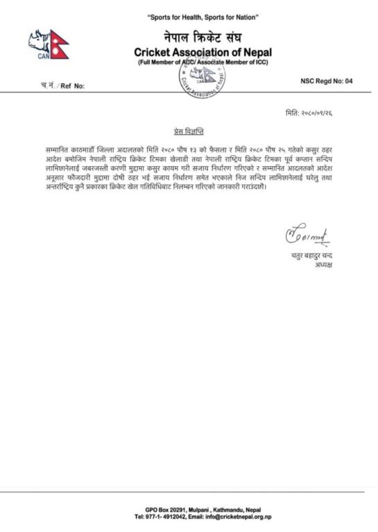 क्यानको विज्ञप्तिमा भनिएको छ, ‘सम्मानित काठमाडौँ जिल्ला अदालतको मिति २०८० पौष १३ को फैसला र मिति २०८० पौष २५ गतेको कसुर ठहर आदेश बमोजिम नेपाली राष्ट्रिय क्रिकेट टिमका खेलाडी तथा नेपाली राष्ट्रिय क्रिकेट टिमका पूर्व कप्तान सन्दिप लामिछानेलाई जबरजस्ती करणी मुद्दामा कसुर कायम गरी सजाय निर्धारण गरिएको र सम्मानित अदालतको आदेशअनुसार फौजदारी मुद्दामा दोषी ठहर भई सजाय निर्धारण समेत भएकाले निज सन्दिप लामिछानेलाई घरेलु तथा अन्तर्राष्ट्रिय कुनै प्रकारका क्रिकेट खेल गतिविधिबाट निलम्बन गरिएको जानकारी गराउँदछौ।’