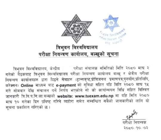 ‘त्रिभुवन विश्वविद्यालय परीक्षा नियन्त्रण कार्यालय बल्खु र क्षेत्रीय परीक्षा नियन्त्रण कार्यालयहरूद्वारा दिइने सेवाहरू ‘ट्रान्सक्रिप्ट, प्रोभिजनल प्रमाणपत्र, पुनर्योग, प्रतिलिपि,करेक्सन’ अनलाइन माध्यमबाट इ पेमेन्टको सुविधासहित यही मिति २०८० माघ १५ गते सोमबारदेखि सञ्चालन गर्ने निर्णय भएकोले सो को कार्यान्वयन विधिसहित विस्तृत जानकारी त्रिवि पनिका बल्खुले आफ्नो वेबसाइटमा माघ १० गतेका दिन प्रविष्ट गरिने ब्यहोरासमेत सम्बन्धित सबैको जानकारीको लागि यो सूचना प्रकाशित गरिएको छ,’सूचनामा उल्लेख छ।