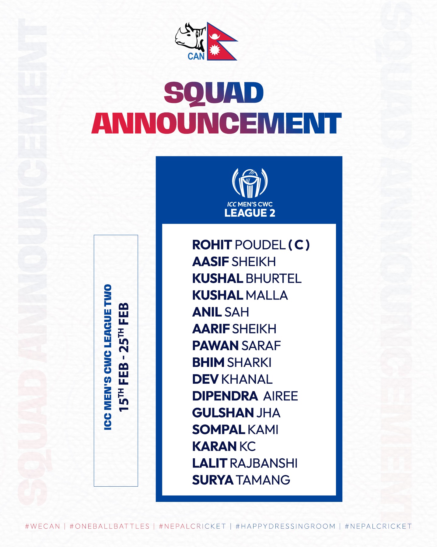 अनिल र देव समेटिएपछि यसअघि टोलीमा परेका रिजन ढकाल र अर्जुन साउद भने बाहिरिएका छन् । लिग–२ को खेलमा कप्तान रोहित पौडेलसहित आसिफ शेख, देव खनाल, अनिल शाह, कुशल भुर्तेल, कुशल मल्ल, आरिफ शेख, पवन सर्राफ, भीम सार्की, दीपेन्द्र सिंह ऐरी, गुलशन झा, सोमपाल कामी, करण केसी, ललित राजवंशी, सूर्य तामाङ छन् ।