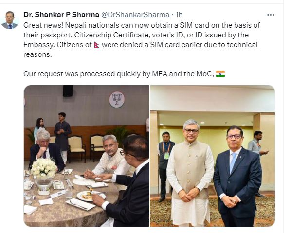 भारतका लागि नेपाली राजदूत डा.शंकर शर्माले सामाजिक सञ्जाल एक्समा पोस्ट गर्दै यसबारे जानकारी गराएका छन् । उनले लेखेका छन् – ‘यसअघि प्राविधिक कारणले नेपालीलाई भारतीय सीमकार्ड दिन अस्वीकार गरिएको थियो । हाम्रो अनुरोधपछि भारतको विदेश मन्त्रालय र सञ्चार मन्त्रालयले स्वीकार गरेको छ । ’