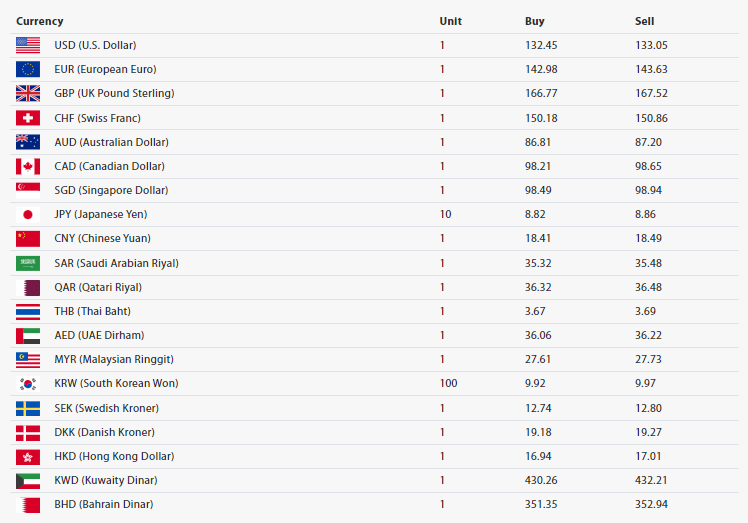 अमेरिकी डलर एकको खरिद दर १३२ रुपैयाँ ४५ पैसा र बिक्री दर १३३ रुपैयाँ ०५ पैसा रहेको छ । युरो एकको खरिद दर १४२ रुपैयाँ ९८ पैसा र बिक्री दर १४३ रुपैयाँ ६३ पैसा रहेको छ ।