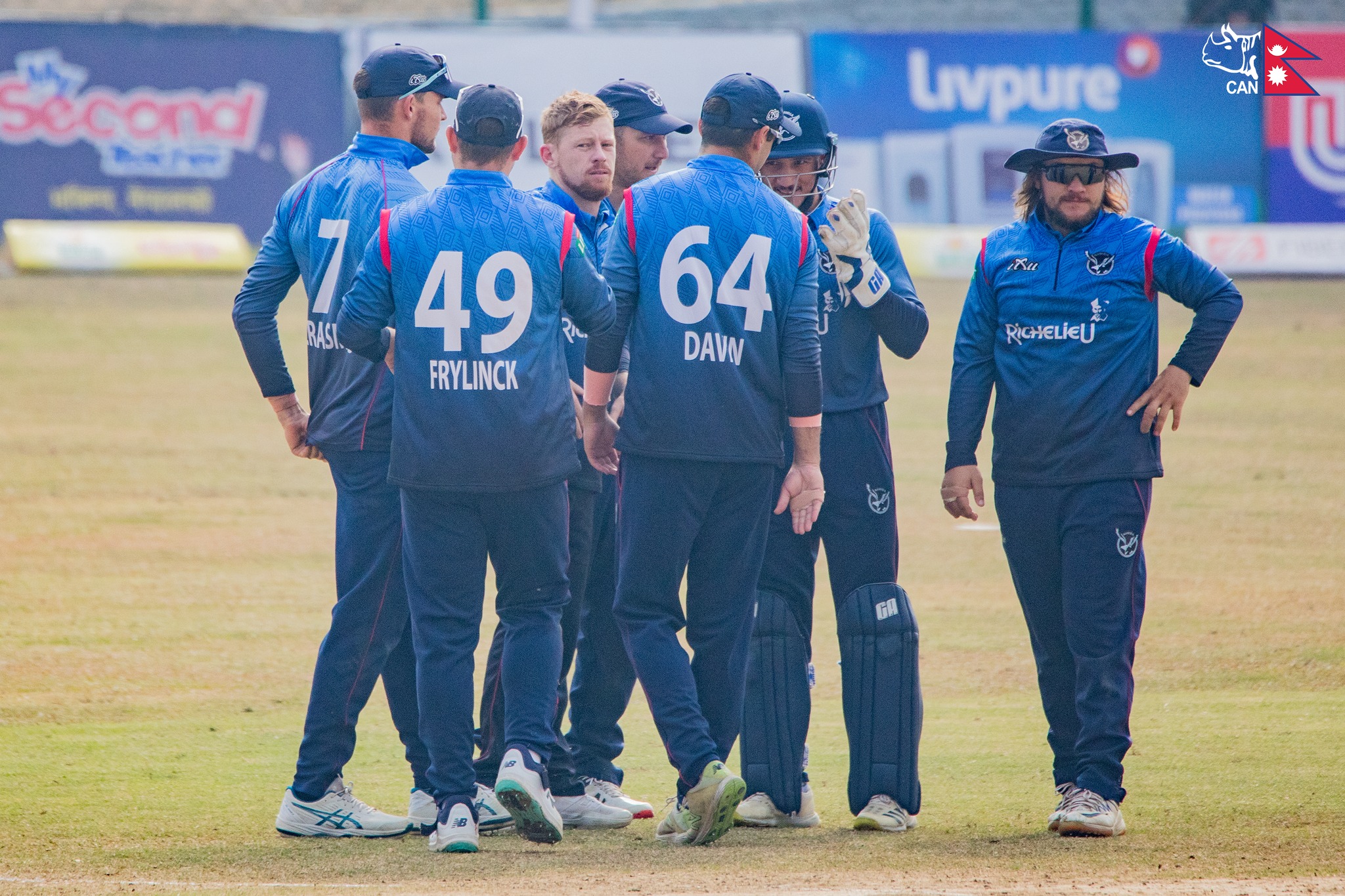 नेपालका कुशल मल्ल ५२ बलमा ३६ रन बनाएर आउट भए । खेलको २६ ओभर ३ बलमा जेरार्ड एरास्मसको बलमा उनी ज्याक ब्रासेलबाट क्याच आउट भए । उनको स्थानमा दीपेन्द्रसिंह ऐरी क्रिजमा आएका छन् ।
