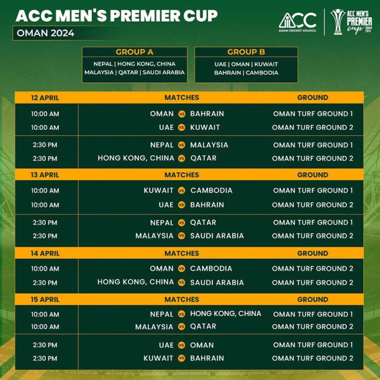 काठमाडौं – एसीसी पुरुष प्रिमियर कपको खेल तालिका सार्वजनिक गरिएको छ । ओमानमा आगामी अप्रिल १२ देखि अप्रिल २१ सम्म हुने एसीसी प्रिमियर कप मा १० देशले भाग लिँदै छन् ।