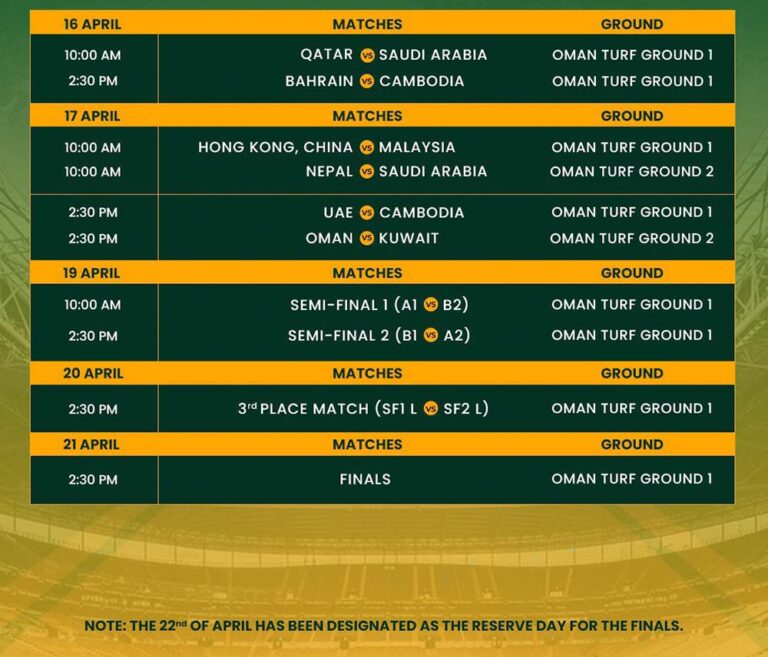 समूह ए मा रहेको नेपालले पहिलो खेल अप्रिल १२ मा मलेसियासँग खेल्ने भएको छ । त्यस्तै नेपालले दोस्रो खेल अप्रिल १३ मा कतारविरुद्ध खेल्नेछ भने तेस्रो खेल अप्रिल १५ मा हङकङविरुद्ध खेल्नेछ । त्यसैगरी नेपालले आफ्नो अन्तिम खेल अप्रिल १७ मा साउदी अरेबियाविरुद्ध खेल्नेछ ।