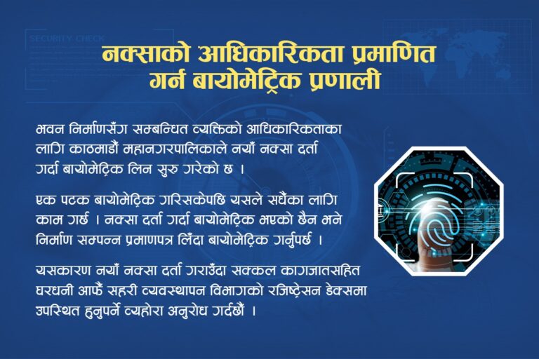 काठमाडौँ – महानगरपालिकाले भवन निर्माण इजाजतका लागि नयाँ नक्सा दर्ता गर्दा घरधनीको बायोमेट्रिक लिन सुरु गरेको छ । मंगलबार ‘फागुन १५’ गतेबाट सहरी व्यवस्थापन विभागको रजिष्ट्रेसन डेक्सबाट यो सेवा थालिएको हो ।