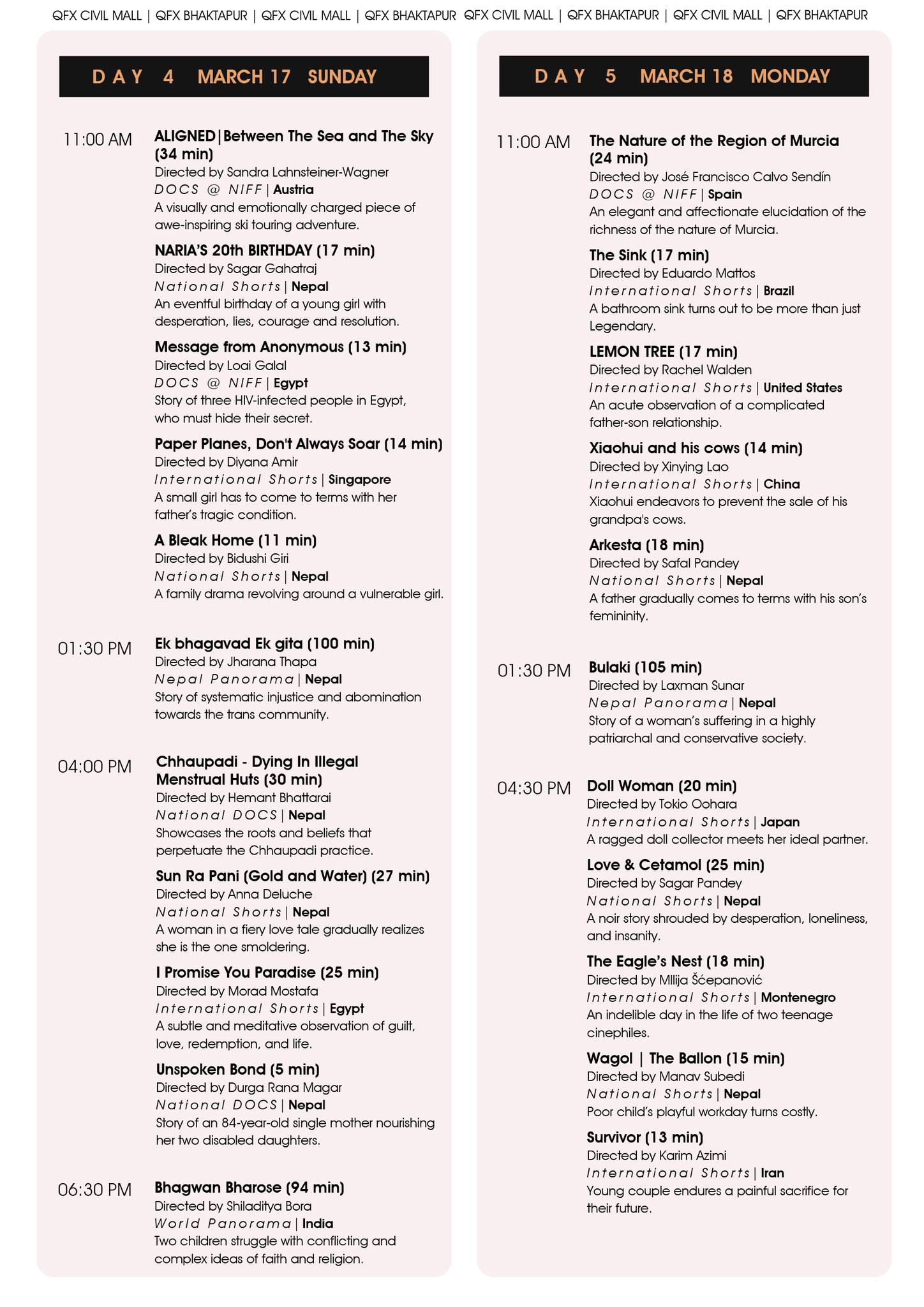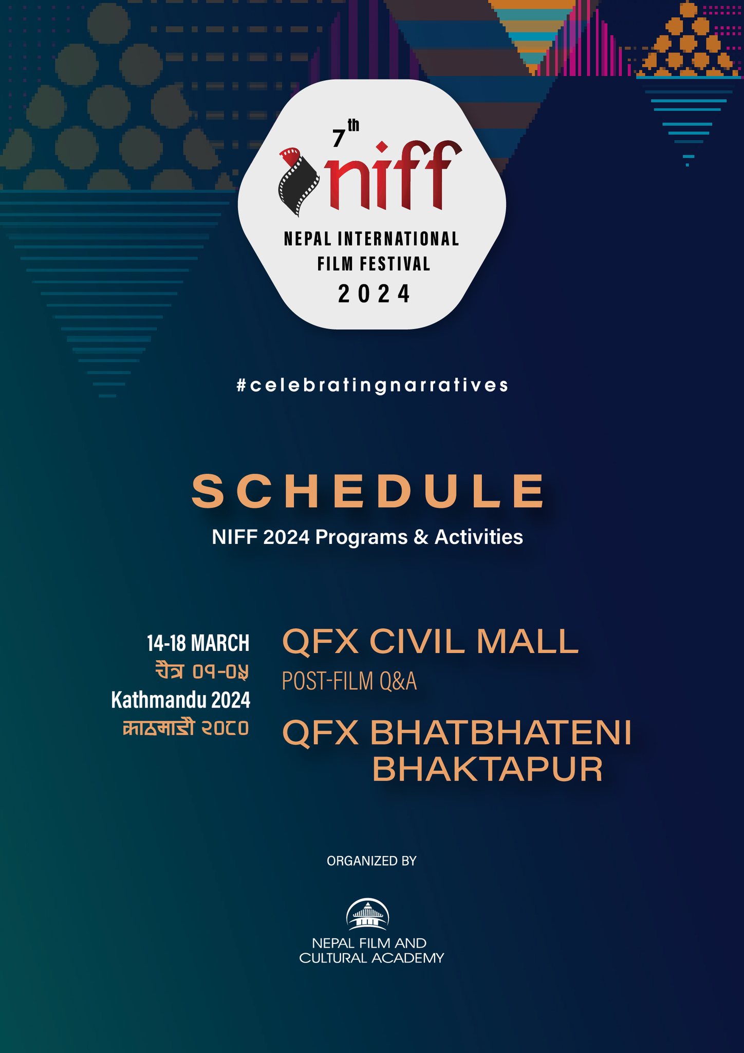 प्रतिस्पर्धामा रहेका फिल्मको प्रदर्शनसँगै महोत्सव अवधिभर फिल्म निर्माणका विभिन्न विधासँग सम्बन्धित रहेर कार्यशाला, छलफल र अन्तर्क्रिया कार्यक्रम पनि आयोजना गरिने पनि आयोजकले जनाएको छ । महोत्सवमा प्रदर्शन हुने चलचित्र क्यूएफएक्स सिनेमाका शाखाहरु सिभिल मल,लबिम मल, भक्तपुर र छायाँ सेन्टरका हलमा प्रदर्शन हुनेछन् ।