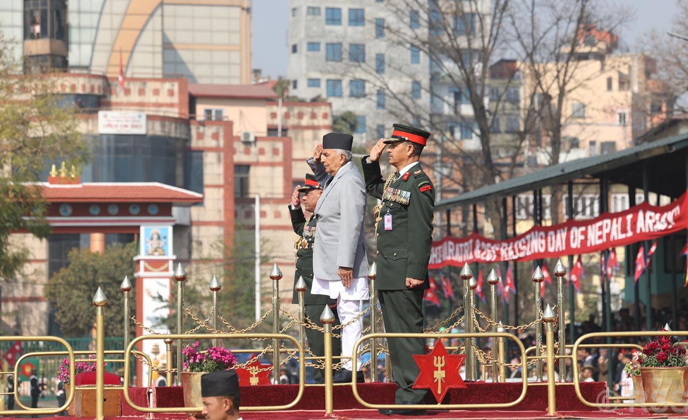 काठमाडौं – राष्ट्रपति रामचन्द्र पौडेल महाशिवरात्रि तथा २६१औँ सेना दिवसका अवसरमा नेपाली सेनाद्वारा सैनिक मञ्च टुँडिखेलमा आज आयोजित विशेष समारोहमा सरिक भएका छन् । सो अवसरमा उनले त्यहाँस्थित सैनिक स्मारकमा पुष्पहार अर्पण गरी श्रद्धाञ्जली व्यक्त गर्नुका साथै नेपाली सेनाद्वारा अर्पण गरिएको सलामी ग्रहण गरे।