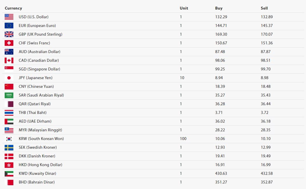 नेपाल राष्ट्र बैंकले सार्वजनिक गरेको विनिमय दर अनुसार सोमबार अमेरिकी डलर एकको खरिद दर १३२ रूपैयाँ २९ पैसा र बिक्री दर १३२ रूपैयाँ ८९ पैसा कायम गरिएको छ । सोमबार युरोपियन युरो एकको खरिद दर १४४ रूपैयाँ ७१ पैसा र बिक्री दर १४५ रूपैयाँ ३७ पैसा तोकिएको छ ।