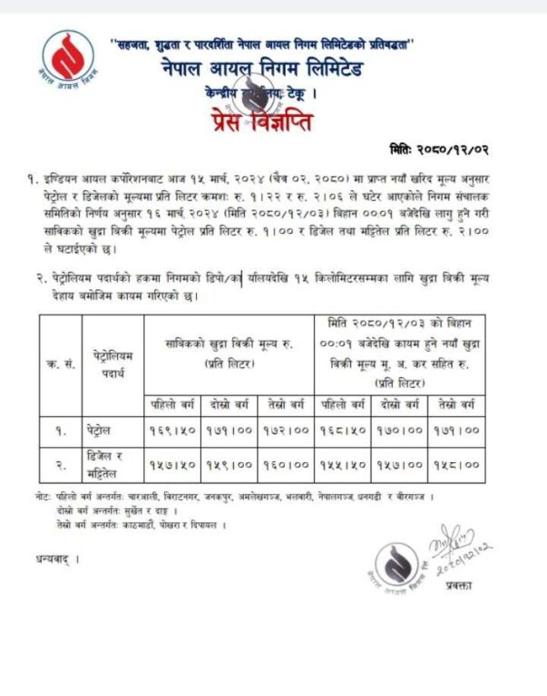 खाना पकाउने ग्यास र हवाई इन्धनको मूल्य भने यथावत राखिएको छ। निगमका अनुसार नयाँ मूल्यसूची आज राति १२ बजेदेखि लागू हुनेछ।
