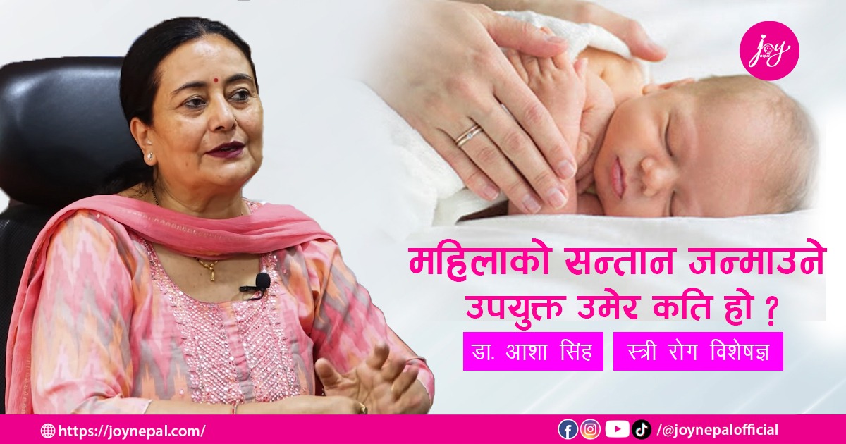 एक महिलाले सन्तान जन्माउने सही उमेर कति हो ? सही समयमा सन्तान जन्माउँदा के फाइदा हुन्छ र उमेर कटिसकेपछि सन्तानको योजना बनाउँदा मातृत्व कति सुरक्षित हुन्छ । यसले के–कस्ता समस्या निम्तिन सक्छन् लगायतका विषयमा केन्द्रित रहेर स्त्री रोग विशेषज्ञ डा. आशा सिंहसँग जोय नेपालका लागि सुस्मिता फुयाँलले गरेको कुराकानी: