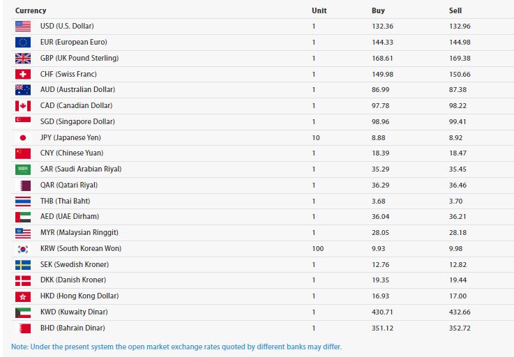 अमेरिकी डलर एकको खरिद दर १३२ रुपैयाँ ३६ पैसा र बिक्री दर १३२ रुपैयाँ ९६ पैसा पुगेको छ । युरो एकको खरिद दर १४४ रुपैयाँ ३३ पैसा र बिक्री दर १४४ रुपैयाँ ९८ पैसा रहेको छ।