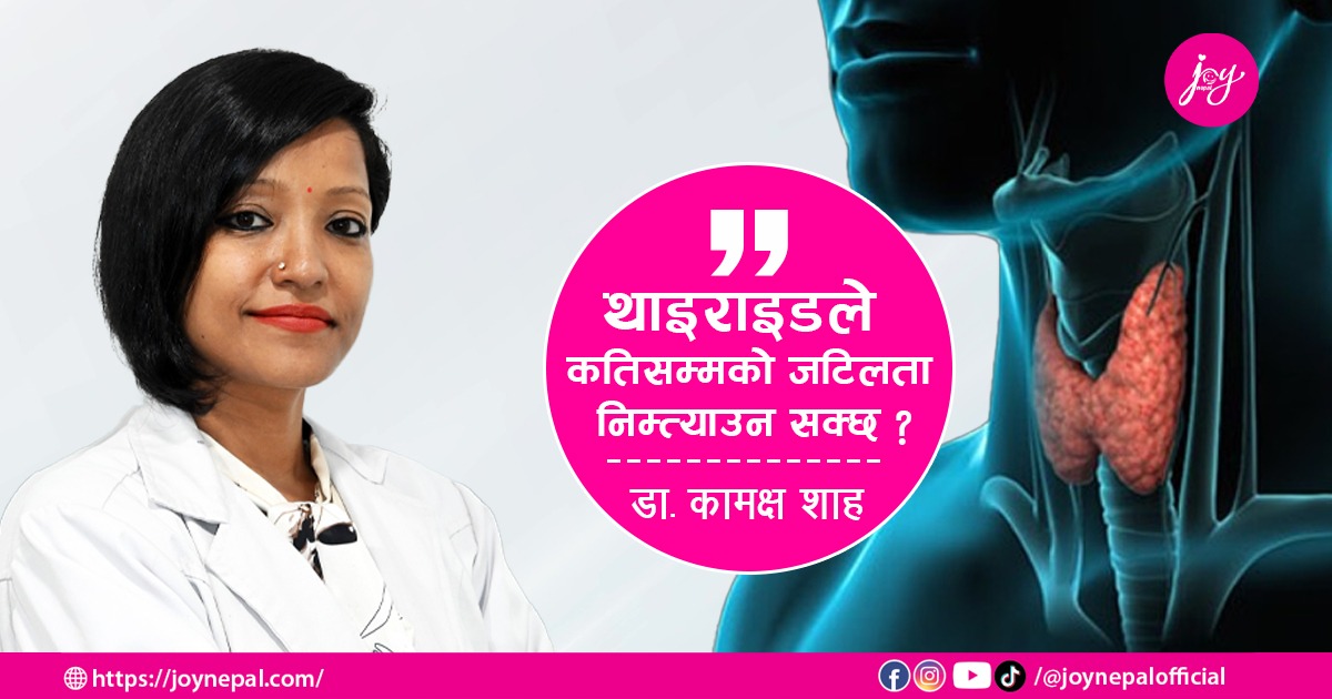 थाइराइड कस्तो रोग हो ? यसका लक्षण र रोकथामका उपायहरु के–कस्ता रहेका छन् ? थाइराइड हुने मुख्य कारण के हो ? यो रोगका कारण के–कस्ता जटिलताहरु निम्तिन सक्छन् भन्ने प्रश्नका वरिपरि रहेर नर्भिक अस्पतालमा कार्यरत डा. कामक्ष शाहसँग जोय नेपालका लागि सुस्मिता फुयाँलले गरेको कुराकानी: