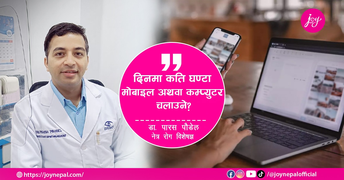 विशेषगरी धेरै लामो समय स्क्रिनमा बस्दा हाम्रो आँखामा कस्तो असर पर्छ भन्ने कुराको हामीले त्यति हेक्का गरेका हुँदैन । डिजिटल स्क्रिनहरुको असरले हाम्रो आँखामा कस्तो असर पर्छ ? कसरी संयमता अपनाउने ? आँखाको सुरक्षामा कस्तो ध्यान दिने लगायतका विषय वरिपरि रहेर नेत्र रोग विशेषज्ञ डा. पारस पौडेलसँग जोय नेपालका लागि सुस्मिता फुयाँलले लिएको अन्तर्वार्ताको सम्पादित अंश: