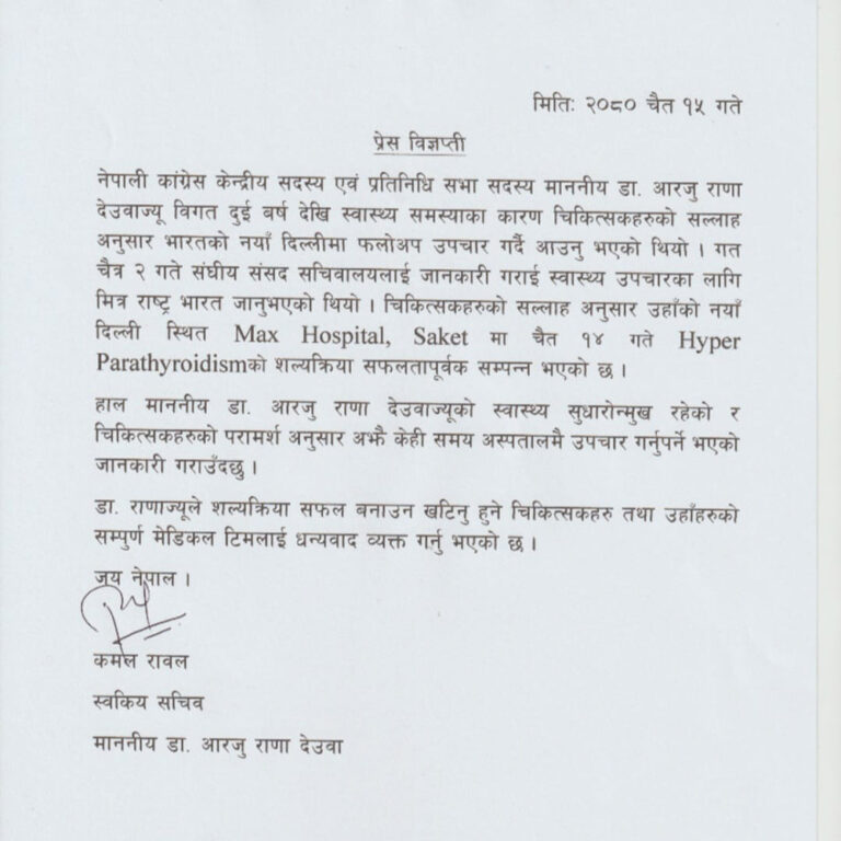 काठमाडौँ – नेपाली कांग्रेसकी केन्द्रीय सदस्य एवं सांसद डा. आरजु राणा देउवाले थाइराइडको शल्यक्रिया गरेकी छन् ।