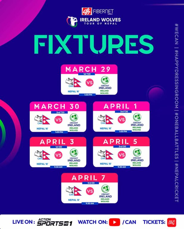 नयाँ तालिका अनुसार अब नेपाल ए ले मार्च २९, ३० र अप्रिल १ मा आयरल्याण्ड वोल्भ्ससँग टी-२० सिरिज र अप्रिल ३, ५ र ७ मा एकदिवसीय सिरिजका खेल्ने तालिका रहेको छ ।