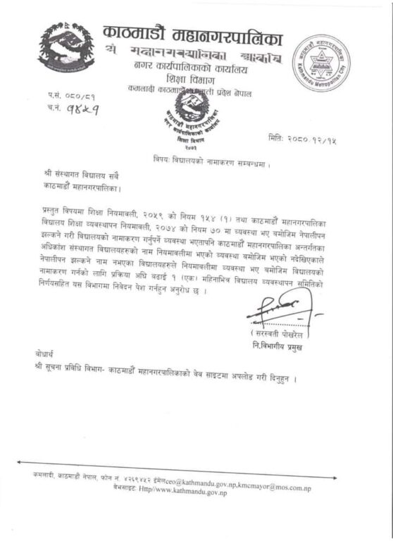 शिक्षा नियमावली २०५९ को नियम १५४ (१) तथा काठमाडौँ महानगरपालिका विद्यालय शिक्षा व्यवस्थापन नियमावली २०७४ को नियम ७० मा व्यवस्था भएबमोजिम नेपालीपन झल्कने गरी विद्यालयको नामकरण गर्नुपर्ने व्यवस्था भएकोले महानगरले सो व्यवस्था बमोजिम विद्यालयहरूको नेपालीकरण गर्न निर्देशन दिएको छ।