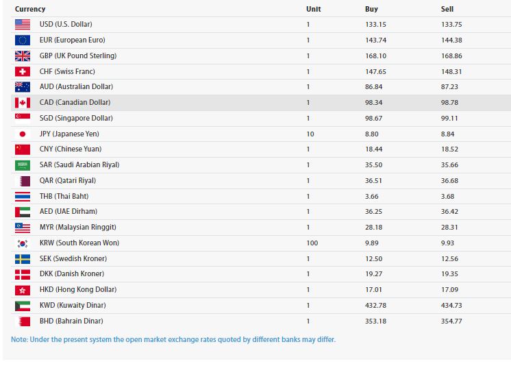 अमेरिकी डलर एकको खरिद दर १३३ रुपैयाँ १५ पैसा र बिक्री दर १३३ रुपैयाँ ७५ पैसा पुगेको छ। युरो एकको खरिद दर १४३ रुपैयाँ ७४ पैसा र बिक्री दर १४४ रुपैयाँ ३८ पैसा रहेको छ।