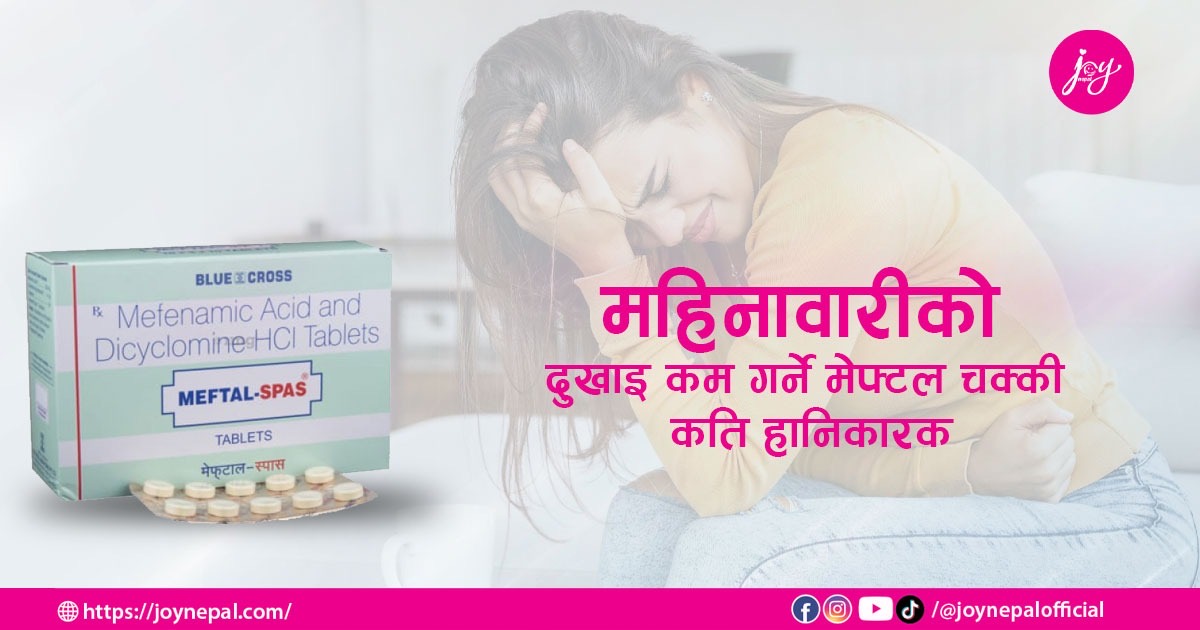 ‘पेट दुख्ने बित्तिकै औषधी खाने बानी चाहीँ बनाउनु हुँदैन,’ उनले भनिन्, ‘शुरुमा सकेसम्म घरेलु उपचारहरु तातो तथा झोलिलो कुरा खाने, व्यायाम गर्ने, हट ब्यागले सेक्ने र अन्तिममा सहनै नसक्ने अवस्था आयो भने मेफ्टल खाँदा हुन्छ ।’