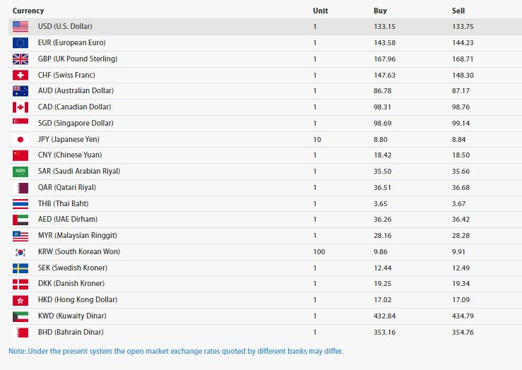 अमेरिकी डलर एकको खरिद दर १३३ रुपैयाँ १५ पैसा र बिक्री दर १३३ रुपैयाँ ७५ पैसा पुगेको छ। युरो एकको खरिद दर १४३ रुपैयाँ ५८ पैसा र बिक्री दर १४४ रुपैयाँ २३ पैसा रहेको छ।