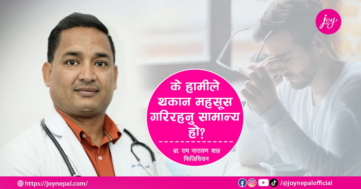 मानव शरीरमा थकान र आलस्यता शारीरिक र मानसिक अभ्यासका कारणले मात्र नभएर कुनै रोगको लक्षण समेत हुने चिकित्सकहरूले बताएका छन् । के थकान पनि कुनै रोगको लक्षण हो भन्ने विषय वरिपरि रहेर वरिष्ठ फिजिसियन तथा छाति रोग विशेषज्ञ डा. राम नारायण साहसँग जोय नेपालका लागि सुस्मिता फुयाँलले लिएको अन्तर्वार्ताको सम्पादित अंश: