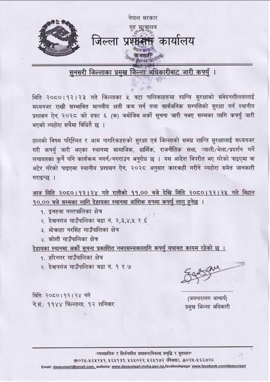 साथै अर्को सूचना जारी नभएसम्मका लागि जिल्लाको समग्र शान्ति सुरक्षालाई मध्यनजर गरी कर्फ्यू जारी भएका स्थानमा सामाजिक, धार्मिक, राजनीतिक सभा, र्याली /भेला/प्रदर्शन नगर्न/नगराउन पनि भनिएको छ ।