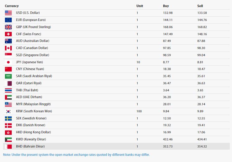 अमेरिकी डलर एकको खरिद दर १३२ रुपैयाँ ९८ पैसा र बिक्री दर १३३ रुपैयाँ ५८ पैसा पुगेको छ। युरो एकको खरिद दर १४४ रुपैयाँ ११ पैसा र बिक्री दर १४४ रुपैयाँ ७६ पैसा रहेको छ।