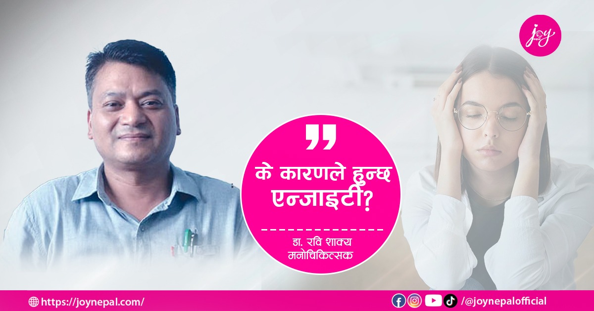 वास्तवमा एन्जाइटी कस्तो समस्या हो ? यसको व्यवस्थापन र उपचार कसरी गर्ने ? एन्जाइटी र डिप्रेसनमा के भिन्नता छ लगायतका विषयमा केन्द्रित रहेर पाटन अस्पतालमा कार्यरत मनोचिकित्सक डा. रवि शाक्यसँग जोय नेपालका लागि सुस्मिता फुयाँलले गरेको कुराकानीको सम्पादित अंश :