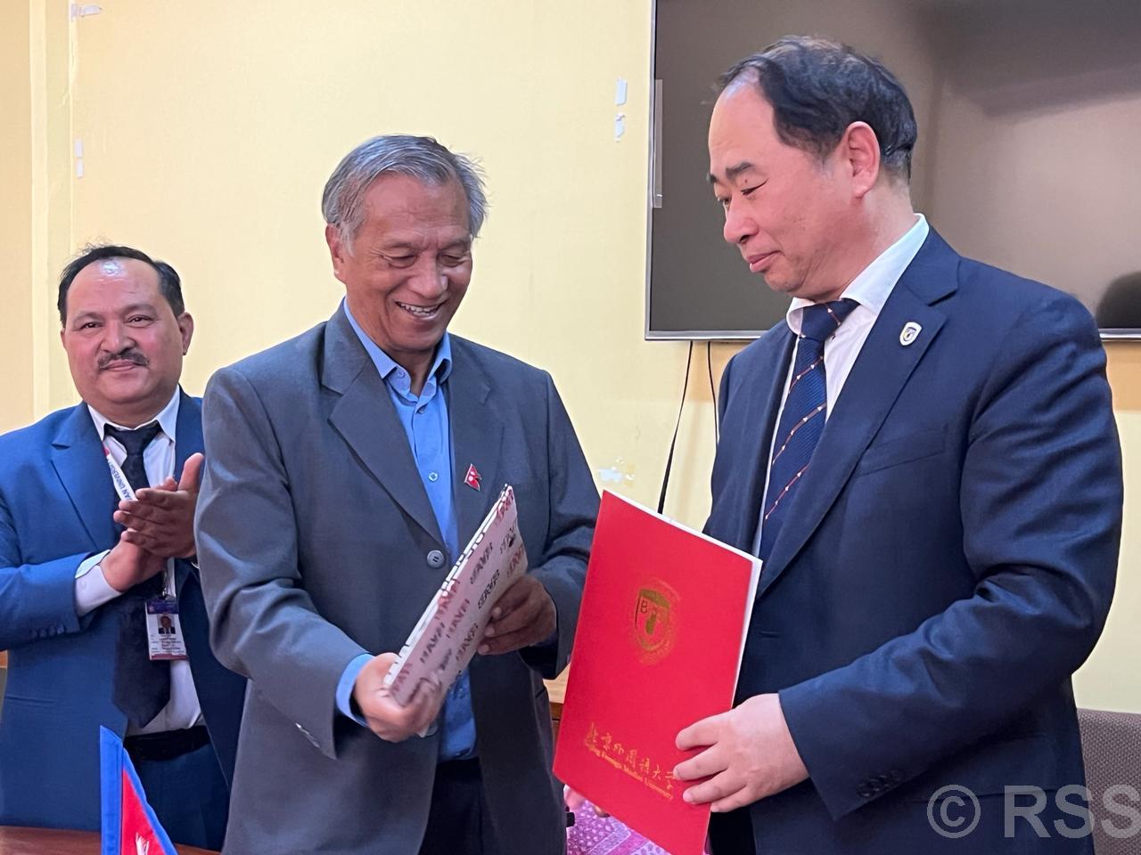 त्रिभुवन विश्वविद्यालयका उपकुलपति प्रा डा केशरजङ्ग बराल तथा बेइजिङ फरेन स्टडिज विश्वविद्यालय परिषद्का अध्यक्ष प्राध्यापक डा. वाङ डिङह्वाबीच यससम्बन्धी सम्झौतामा आज हस्ताक्षर भयो ।