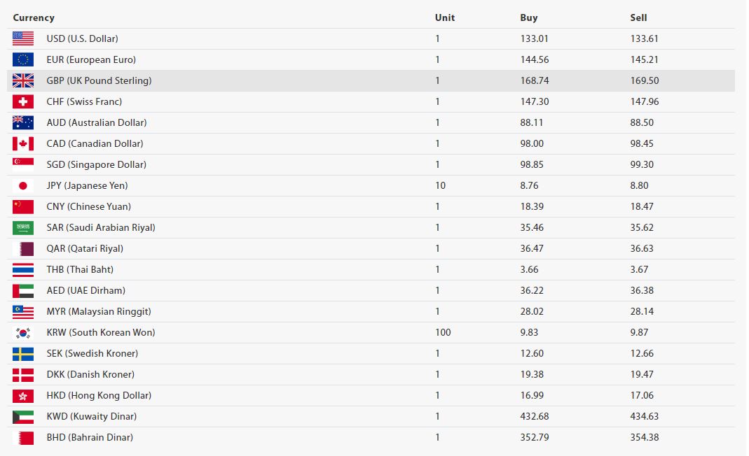 बेलायती पाउण्ड एकको खरिद दर१६८ रुपैयाँ ७४ पैसा र बिक्री दर १६९ रुपैयाँ ५० पैसा रहेको छ ।