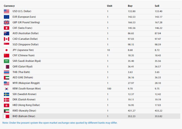 अमेरिकी डलर एकको खरिद दर १३२ रुपैयाँ ८० पैसा र बिक्री दर १३३ रुपैयाँ ४० पैसा पुगेको छ। युरो एकको खरिद दर १४२ रुपैयाँ ५३ पैसा र बिक्री दर १४३ रुपैयाँ १७ पैसा रहेको छ।