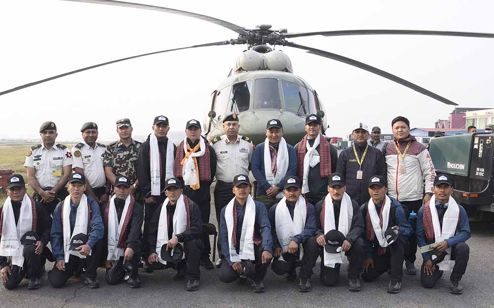 काठमाडौँ – सगरमाथा, ल्होत्से तथा नुप्त्से हिमाल सफाइको लागि १२ जना सैनिक र १ जना शेर्पा सरदारसहित १३ जनाको सफा हिमाल अभियान-२०२४ मा संलग्न रहने टोली नेपाली सेनाको हवाई साधन मार्फत स्याङ्गबोचे इलाकामा अवतरण भएको छ ।