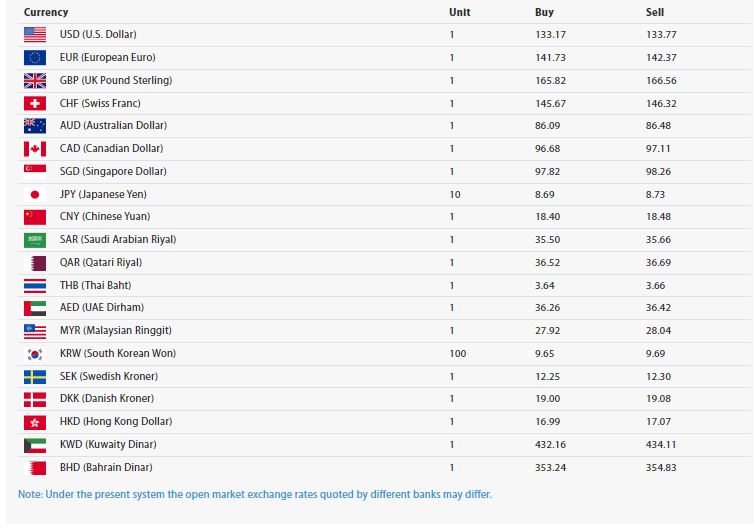 अमेरिकी डलर एकको खरिद दर १३३ रुपैयाँ १७ पैसा र बिक्री दर १३३ रुपैयाँ ७७ पैसा पुगेको छ। युरो एकको खरिद दर १४१ रुपैयाँ ७३ पैसा र बिक्री दर १४२ रुपैयाँ ३७ पैसा रहेको छ।