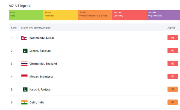 एयर क्वालिटी इन्डेक्सका अनुसार आज पनि काठमाडौँ उपत्यकाको वायु प्रदूषण तह बढेर विश्वमै सबैभन्दा बढी रहेको छ । बिहीबार १७८ एक्यूआइसहित काठमाडौँ शीर्ष स्थानमा रहेको छ । यो स्वास्थ्यको हिसाबले अस्वस्थ मानिन्छ । त्यस्तै दोस्रो स्थानमा पाकिस्तानको लाहोर शहर रहेको छ । लाहोर १७० एक्यूआईसहित दोस्रो स्थानमा छ ।