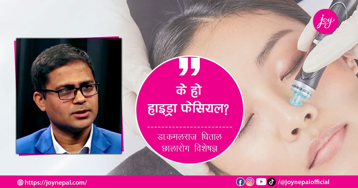 हाइड्रा फेसियलले अनुहारको चाया, पोतो, डन्डिफोर लगायत अन्य दाग धब्बा सबै हटाउने दाबी गरिएको छ । हाइड्रा फेसियल कस्तो प्रविधि हो ? के यसले वास्तवमै अनुहारको चाया, पोतो, दाग सबै हटाउँछ या हल्ला मात्रै हो भन्ने प्रश्नहरुमा केन्द्रित भएर रेडियन्ट स्किन केयर एण्ड हेयर ट्रान्सप्लान्ट सेन्टरमा कार्यरत छालारोग विशेषज्ञ डा. कमलराज धितालसँग जोय नेपालका लागि सुस्मिता फुयाँलले लिएको अन्तर्वार्ताको सम्पादित अंश: