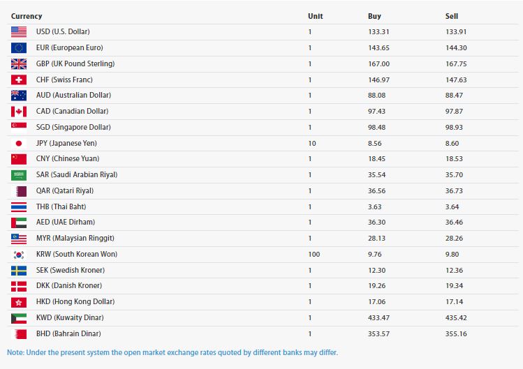 अमेरिकी डलर एकको खरिद दर १३३ रुपैयाँ ३१ पैसा र बिक्री दर १३३ रुपैयाँ ९१ पैसा पुगेको छ। युरो एकको खरिद दर १४३ रुपैयाँ ६५ पैसा र बिक्री दर १४४ रुपैयाँ ३० पैसा रहेको छ।
