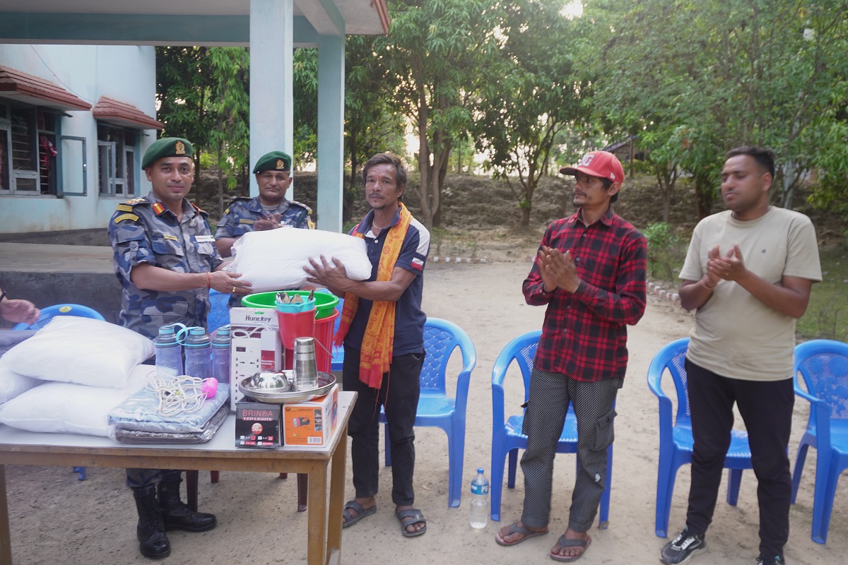 सशस्त्र प्रहरीको  ७ वैद्यनाथ बाहिनी मुख्यालय कैलालीमा रहेका विभिन्न राहतका सामान नं. ३५ शैलेश्वरी गण कञ्चनपुरका गणपति सशस्त्र प्रहरी उपरीक्षक खगेन्द्र बहादुर चन्दले वितरण गरेका हुन् ।