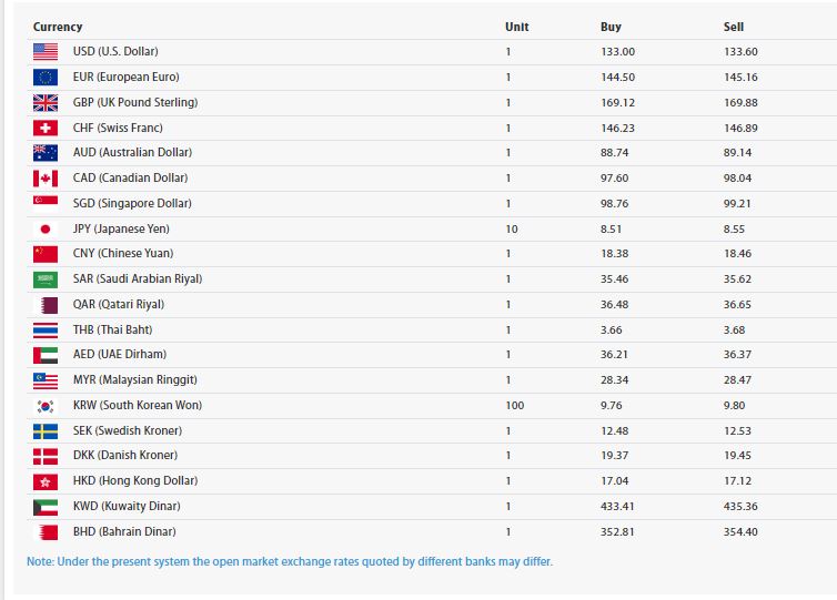 अमेरिकी डलर एकको खरिद दर १३३ रुपैयाँ शून्य पैसा र बिक्री दर १३३ रुपैयाँ ६० पैसा पुगेको छ। युरो एकको खरिद दर १४४ रुपैयाँ ५० पैसा र बिक्री दर १४५ रुपैयाँ १६ पैसा रहेको छ।