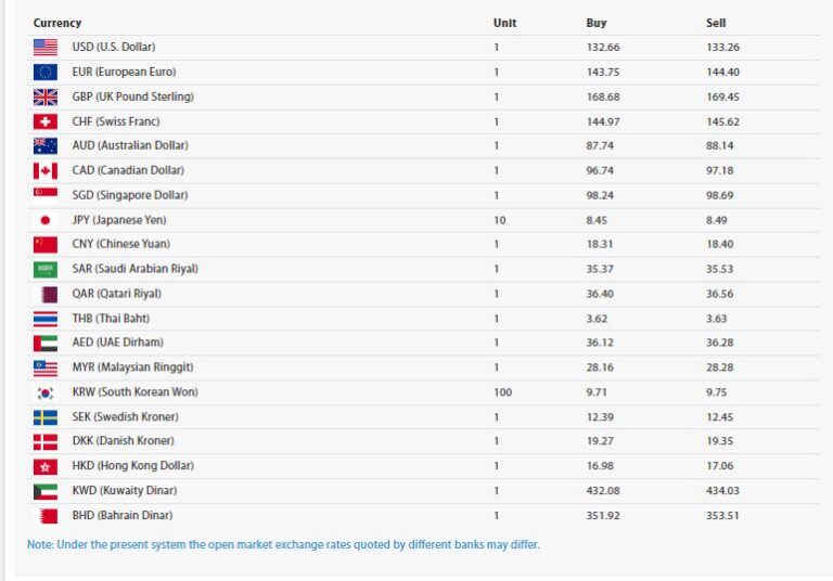 अमेरिकी डलर एकको खरिद दर १३२ रुपैयाँ ६६ पैसा र बिक्री दर १३३ रुपैयाँ २६ पैसा पुगेको छ। युरो एकको खरिद दर १४३ रुपैयाँ ७५ पैसा र बिक्री दर १४४ रुपैयाँ ४० पैसा रहेको छ।