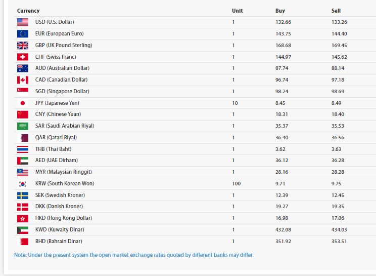 यस्तै, आज अमेरिकी डलरको खरिद दर १३२ रुपैयाँ ६६ पैसा र बिक्री दर १३३ रुपैयाँ २६ पैसा रहेको छ । आज युरो एकको खरिद दर १४३ रुपैयाँ ७५ पैसा र बिक्री दर १४४ रुपैयाँ ४० पैसा रहेको छ।