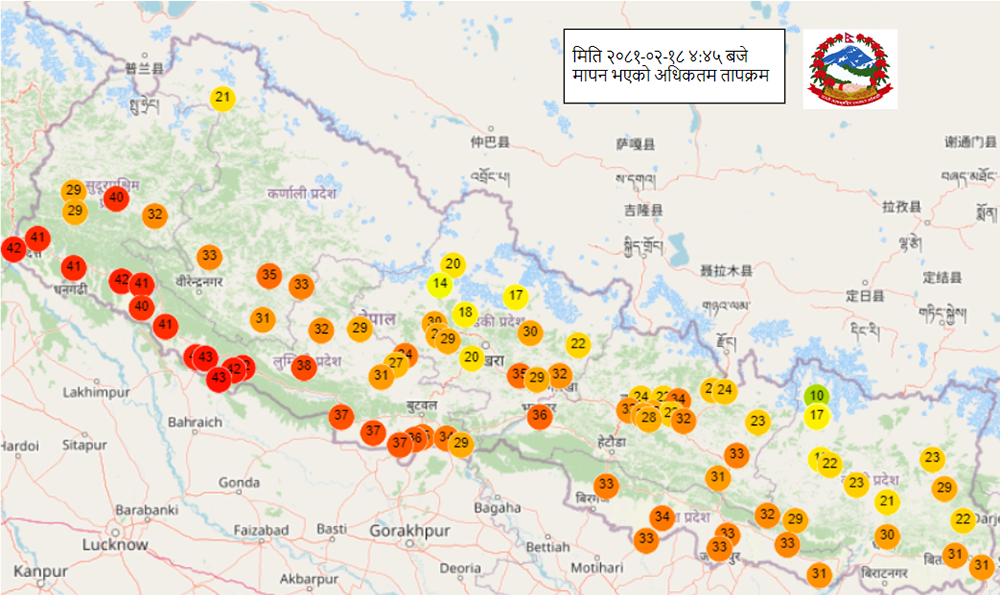 काठमाडौँ – मौसम पूर्वानुमान महाशाखाले देशभर तातो लहर चलिरहेकोले सतर्क रहन अपिल गरेको छ । महाशाखाका अनुसार सुदूरपश्चिम र लुम्बिनी प्रदेशका तराई भू(भागका केही स्थानहरूमा बिगत केही दिन देखि अधिकतम तापक्रम ४० डिग्री सेल्सियस वा सो भन्दा बढी मापन गरिएको छ ।