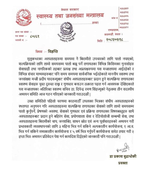 शल्यक्रिया गर्न पालो कुर्नुपर्ने समस्या अन्त्य गर्न उच्चस्तरीय अध्ययन समिति गठन