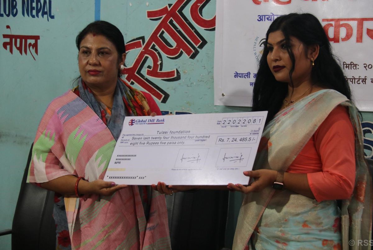 आज यहाँ आयोजित एक कार्यक्रममा च्याप्टरका अध्यक्ष सपना सेढाईं थपलियाले तुलसालयका अध्यक्ष सरु सुवेदीलाई सहयोग चेकमार्फत सहयोग रकम हस्तान्तरण गरिन् ।