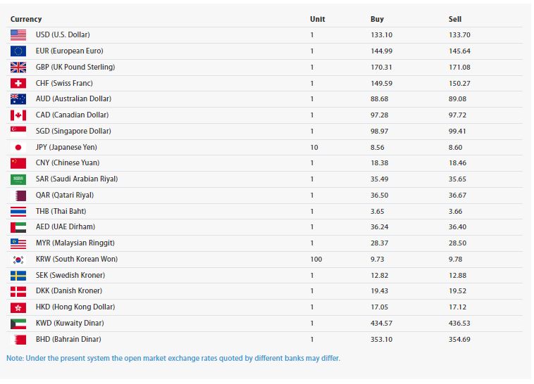 अमेरिकी डलर एकको खरिद दर १३३ रुपैयाँ १० पैसा र बिक्री दर १३३ रुपैयाँ ७० पैसा पुगेको छ। युरो एकको खरिद दर १४४ रुपैयाँ ९९ पैसा र बिक्री दर १४५ रुपैयाँ ६४ पैसा रहेको छ।