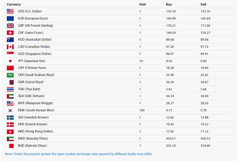 अमेरिकी डलर एकको खरिद दर १३३.१० रुपैयाँ रहेको छ भने बिक्री दर १३३.७० रुपैयाँ रहेको छ । त्यस्तै युरोपियन युरो एकको खरिद दर १४४.९९ रुपैयाँ रहेको छ भने बिक्री दर १४५.६४ रुपैयाँ रहेको छ ।