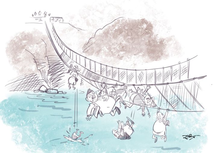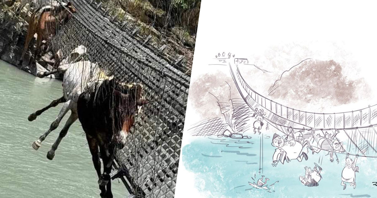 उक्त कार्टुनमा दुई पहाडहरुलाई जोडिएको झोलुङ्गे पुलमा केही मानिसहरु लम्पसार परेका, केही झुण्डिरहेका, केही झरिरहेका र केही त पुलमै खसेर डुबिरहेका देखिन्छ । जुन मानिसहरुमा राजनीतिक दलका नेताहरुको स्वरुप देखिन्छ ।