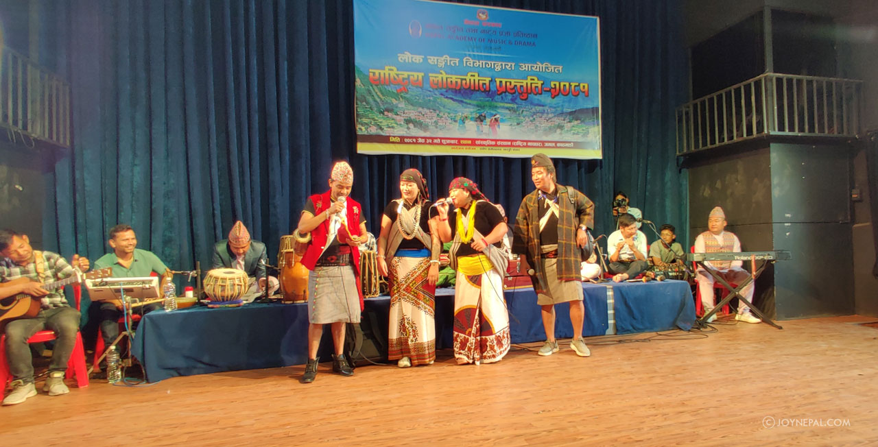 नेपाल सङ्गीत तथा नाट्य प्रज्ञा प्रतिष्ठान, लोक सङ्गीत विभागद्वारा आयोजित ‘राष्ट्रिय लोक गीत प्रस्तुति–२०८१’ अन्तर्गत जमलस्थित राष्ट्रिय नाचघरमा शुक्रवार गाउँघरलाई नै बिर्साउने लोकलयको धुन र परिवेश देखिएको थियो । मौलिक पहिरन, मौलिक नै बाजामा लोक सर्जकहरुले गाउँबस्तीको झल्को मेटाउने काम गरे ।