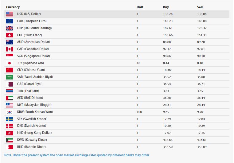 अमेरिकी डलर एकको खरिद दर १३३ रुपैयाँ २४ पैसा र बिक्री दर १३३ रुपैयाँ ८४ पैसा पुगेको छ। युरो एकको खरिद दर १४३ रुपैयाँ २३ पैसा र बिक्री दर १४३ रुपैयाँ ८८ पैसा रहेको छ।