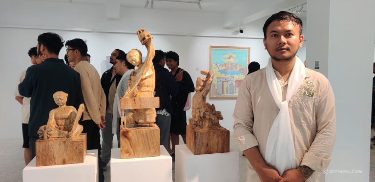 त्यस्तै माहोलमा एक जना पुरुष भने काठको मुढामा कलाको स्वरुप दिइरहेका छन् । लाजिम्पाटस्थित ताक्पा ग्यालरीमा देखिएको उक्त दृश्य केवल कलाको फर्ममा मात्र थियो ।